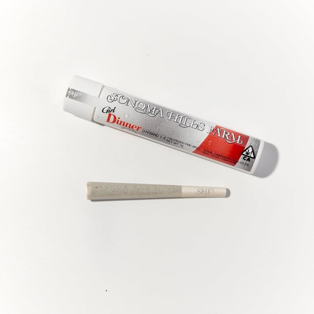 Premium craft cannabis grown in the California sunshine, available in single pre-rolls intentional blend. A charmingly decadent fusion of our top seasonal CBD and THC flavors. Girl Dinner is a flavor-forward 1:1 balanced ratio pre-roll designed to feel like treating yourself to a beautifully curated spread—sweet, bright, balanced, and irresistibly comforting. The result is a deliciously layered sensory journey— with richness, sparkling fruit florals, and a creamy decadence—a pre-roll that feels like indulging in your favorite little luxuries. Girl Dinner invites you to take a moment for yourself, savor the sweetness, and enjoy the simple pleasure of a beautifully curated blend.